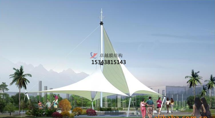 3.污漬:污漬也是在安徽張拉膜景觀中常見的疵病,特別是在早期選用PV膜材建成的一些張拉膜景觀.原因主要是在設于膜材外用PVC涂層隨時間推移老化/剝落所致.由于制作安裝缺陷導致膜面在焊接縫處留下污漬或不慎利物刮劃涂層,使織物直接接受紫外線的作用,時間久了也會出現(xiàn)局部污漬.