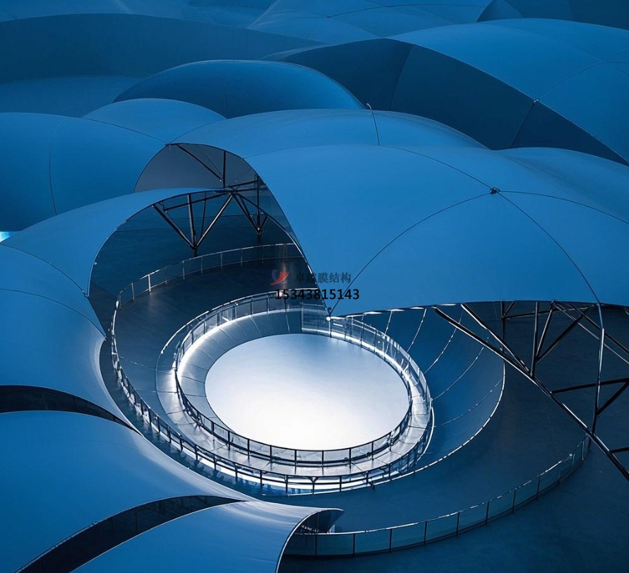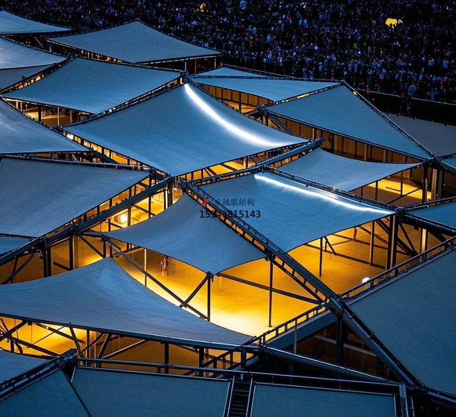 形狀多樣性:膜結(jié)構(gòu)憑借其柔性資料的特性,可以完成自由空間曲面的規(guī)劃,造型豐厚多樣。從簡練流通的單曲面到復(fù)雜多變的多曲面,從高雅的弧形到賦有張力的異形,膜結(jié)構(gòu)舞臺(tái)可以依據(jù)扮演主題、場所環(huán)境以及規(guī)劃師的創(chuàng)意,塑造出千變?nèi)f化的形狀。如在一場以 “天然之舞” 為主題的舞蹈扮演中,舞臺(tái)膜結(jié)構(gòu)規(guī)劃成了一片隨風(fēng)飄動(dòng)的樹葉形狀,膜材的輕柔質(zhì)感與樹葉的靈動(dòng)形狀完美結(jié)合,為舞蹈藝人們打造了一個(gè)充溢天然氣味的扮演空間,讓觀眾似乎置身于森林之中,增強(qiáng)了扮演的沉溺感與藝術(shù)感染力。