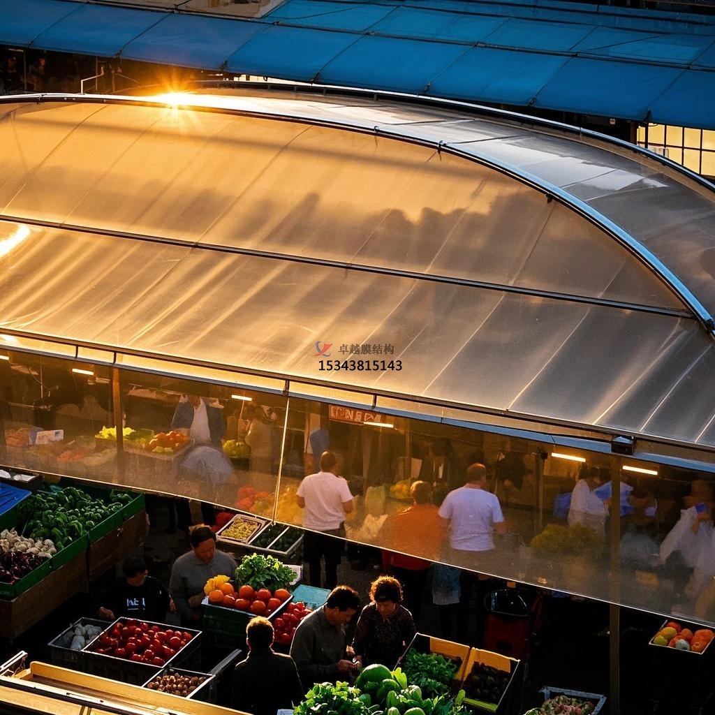 在節(jié)能環(huán)保成為全球共識的今天,膜結(jié)構(gòu)在農(nóng)貿(mào)市場中的應(yīng)用體現(xiàn)了綠色建筑的理念。如前文所述,膜材的良好透光性減少了白天對人工照明的需求,降低了能源消耗。同時,膜結(jié)構(gòu)的保溫隔熱性能也有助于調(diào)節(jié)市場內(nèi)部的溫度,減少空調(diào)等設(shè)備的使用頻率,進一步節(jié)約了能源。此外,膜材可回收利用,在農(nóng)貿(mào)市場進行改造或拆除時,不會產(chǎn)生大量的建筑垃圾,對環(huán)境友好。這種節(jié)能環(huán)保的特性,不僅符合現(xiàn)代城市發(fā)展的要求,也為市民提供了一個更加綠色、健康的購物環(huán)境。?