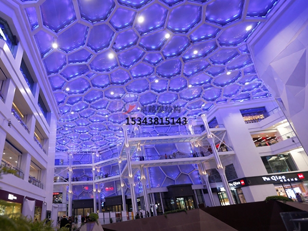 ETFE膜廠家更后通過氣枕制作過程包括膜片疊合及定位焊接、邊帶定位焊接、氣枕周邊焊接等工序。在氣枕周邊裝上夾具,將其固定在檢查專用的鋼架上。連接臨時充氣管,想氣枕內(nèi)部充入空氣,使其內(nèi)壓達(dá)到或超過實(shí)際工作壓力,并保持壓力一定時間。檢查氣枕的各焊縫的焊接強(qiáng)度及密封情況,并檢查氣枕的矢高是否符合設(shè)計(jì)要求。