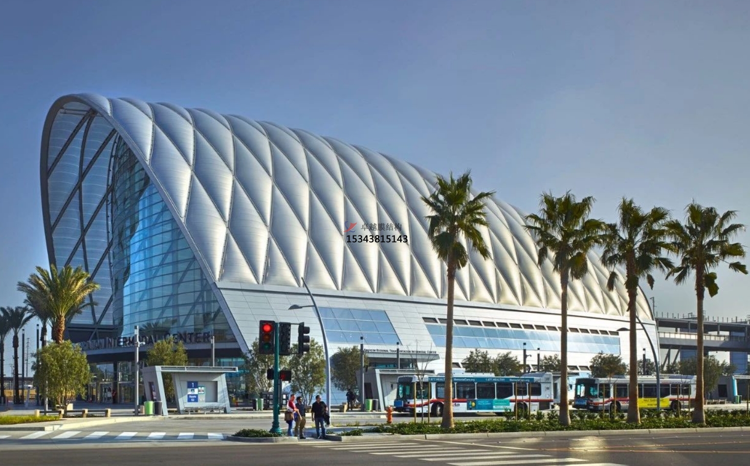 ETFE設(shè)計強度低,單層ETFE適用于跨度較小的結(jié)構(gòu),比較典型的應(yīng)用是設(shè)置于桁架弦桿之間,形成采光帶,且通過ETFE與PVC/PTFE不同材質(zhì)的組合使用,產(chǎn)生更為豐富的視覺效果。
