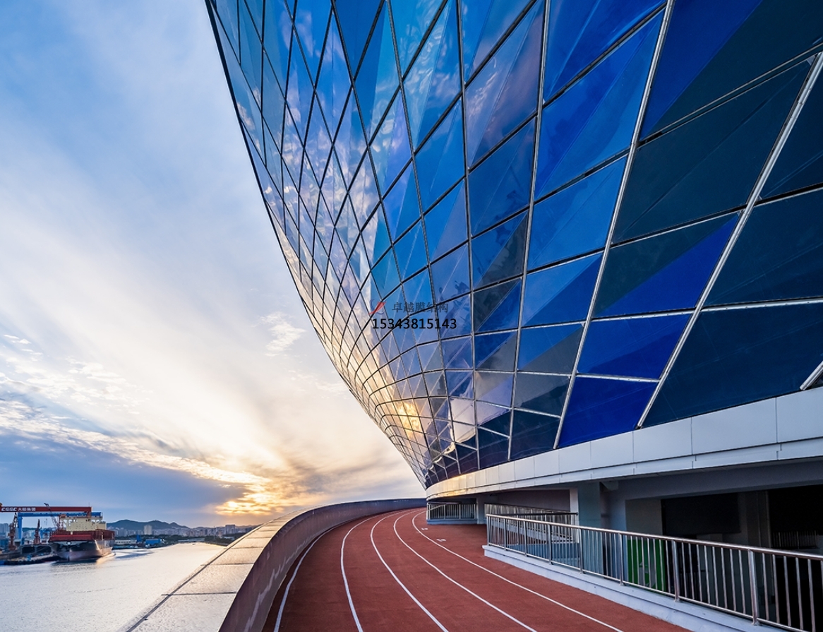 梭魚灣足球場設計靈感來源于“海浪與海螺”,設計理念為“炫彩疊浪”,建筑立面定妝色“海洋藍”,頂棚呈白色,“藍海白云”與飾面象征波光粼粼的水之形態(tài),將大連的海洋文化、足球精神融于一體。