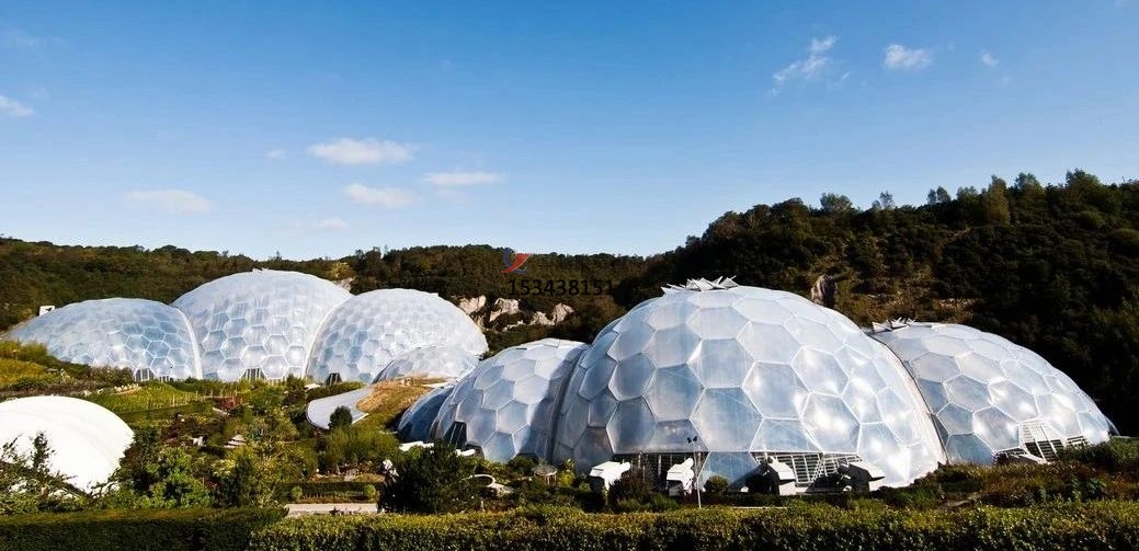 “伊甸園”項(xiàng)目位于英國(guó)的康沃爾郡,是在廢棄的礦山上建的全球最大的生態(tài)溫室。主要由8個(gè)充滿(mǎn)未來(lái)主義色彩的巨大蜂巢式穹頂建筑構(gòu)成,其中每4座穹頂狀建筑連成一組。“伊甸園”的穹頂穹頂架由鋼管構(gòu)成,拼成尺寸9米大小的六角形天窗,天窗中間鋪設(shè)半透明的ETFE薄膜材料。在形態(tài)上像放大了無(wú)數(shù)倍的“大水泡”。"大水泡"里培育著原產(chǎn)于非洲、亞洲、歐洲、大洋洲和美洲的熱帶植物。
