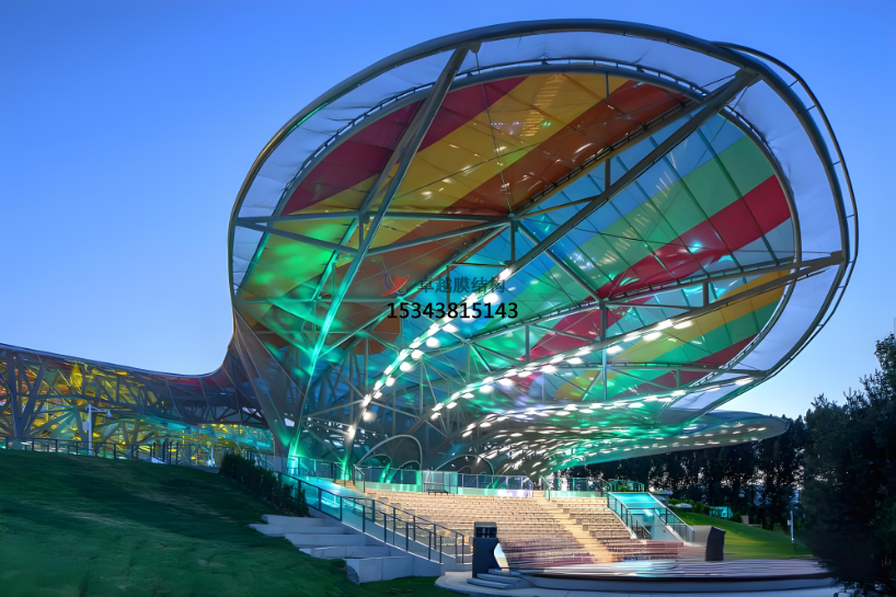 為使蝴蝶造型及色彩的視覺效果更加生動形象,劇場屋面采用了ETFE彩色膜結構。選用6種不同顏色的膜材進行拼接。包括深紅、深綠、橙色、藍色、紅色、綠色6種色彩,其膜結構展開面積近6000m2,最大膜單元面積超過309 m2。與常規(guī)涂裝不同,媯汭劇場這只“彩蝶”的鮮艷色彩不會因時間推移和風霜雨雪褪色,而是會始終鮮亮如初。