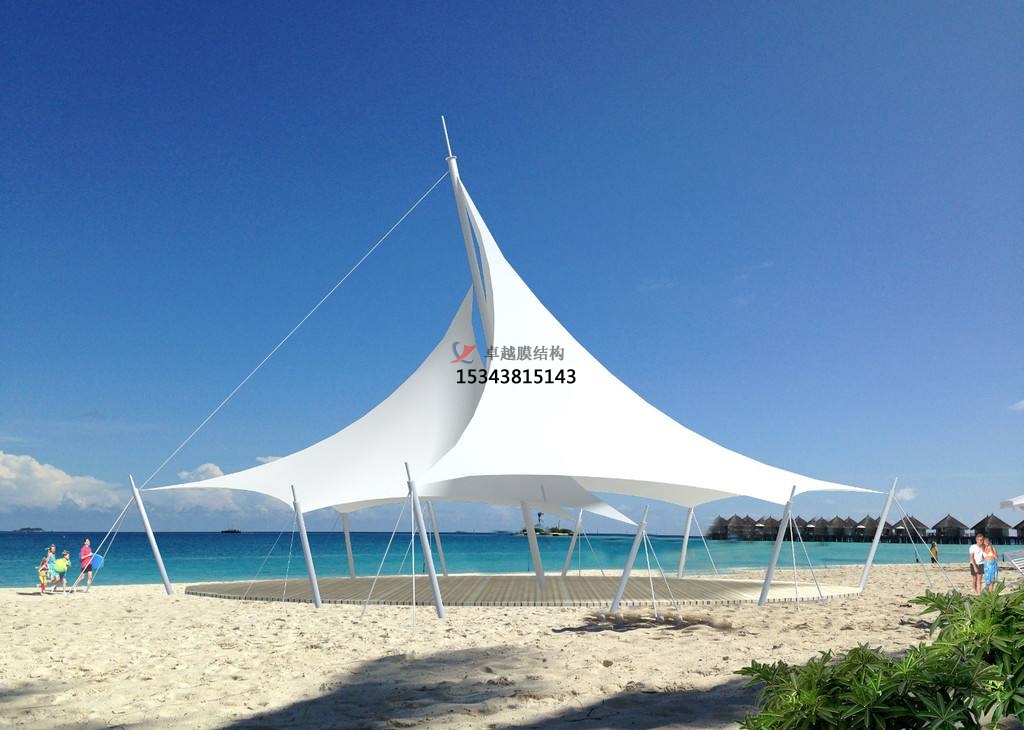 膜結構景觀施工中,索、附屬鋼結構在施工完成之后對每處單元用站儀進行相對位置測量, 依據(jù)實際的測量數(shù)據(jù)進行裁剪設計膜單元。因該景觀工程索膜結構為空間曲面, 裁剪就是用平面膜材來表示空間曲面, 因此裁剪難度很大, 通過拉伸試驗進行準確確定。隔板下料完成后,根據(jù)排水方向和隔板接頭確定熱熔方案。