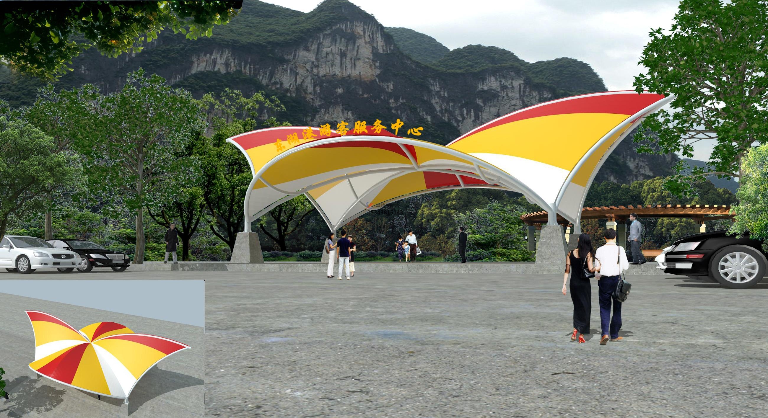 (2)藝術(shù)性。景觀膜結(jié)構(gòu)遮陽棚突破了傳統(tǒng)的建筑結(jié)構(gòu)類型,以造型學(xué)、色彩學(xué)為依托,可結(jié)合自然條件,充分發(fā)揮建筑師的想象力,根據(jù)創(chuàng)意建造出傳統(tǒng)建筑難以實(shí)現(xiàn)的曲線及各種造型,且色彩豐富,富有時(shí)代氣息,體現(xiàn)結(jié)構(gòu)構(gòu)件受力之美。配合燈光易形成夜景,給人以現(xiàn)代美的享受。