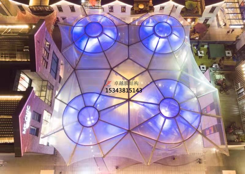 膜結(jié)構(gòu)的曲面造型與半透明特性,可模擬四季光影變幻,如某項(xiàng)目通過投影技術(shù)在天幕呈現(xiàn)沉浸式星空、森林等主題場景,成為網(wǎng)紅打卡地‌。