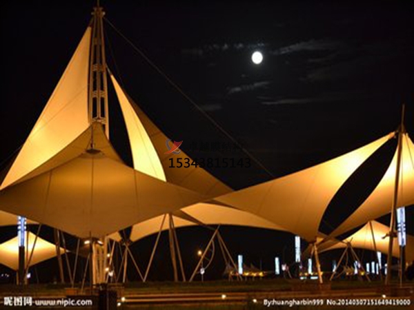 3.因?yàn)槟げ牡淖陨硖匦?,在燈火的照射下能?gòu)成艷麗繽紛的美景。景象膜結(jié)構(gòu)它不僅能夠供給遮陽(yáng)擋雨的空間,更因?yàn)檫@種輕盈優(yōu)美的造型能給人們帶來(lái)時(shí)髦、輕松的休閑感受。