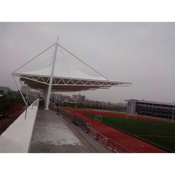 選用膜材拉力:5900N-6900N 鋼構選用材料: 鞍鋼生產的Q235B高頻焊管及Q345無縫鋼管 工程施工周期:總工期29日歷天 索膜結構形式:管桁架四邊張拉索膜結構看臺 工程完工面積:膜材展開面積589㎡" />