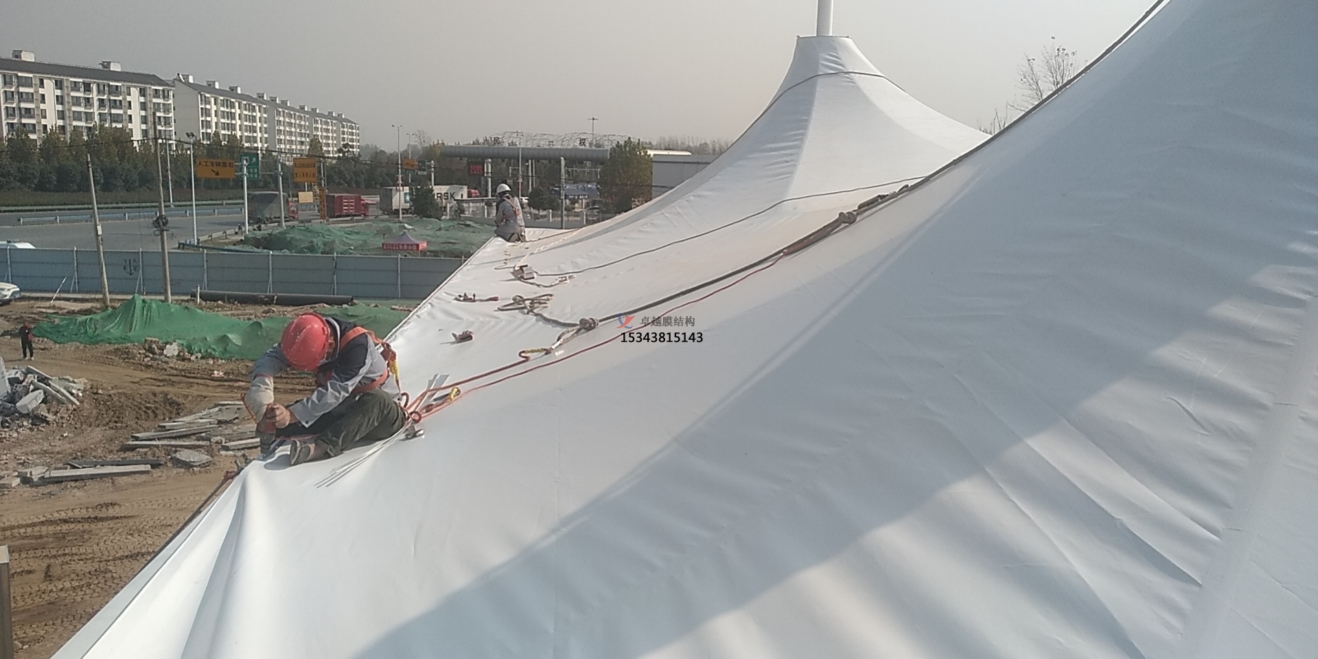 ①要在支承結(jié)構(gòu)的構(gòu)件表面的油漆干后才開始安裝膜面,以防止膜面因油漆而粘結(jié)在支承構(gòu)件上、膜面受到污染,甚至因粘結(jié)造成局部應(yīng)力集中導(dǎo)致膜面撕裂;
