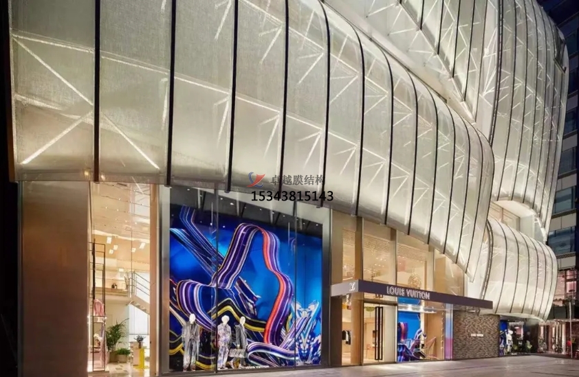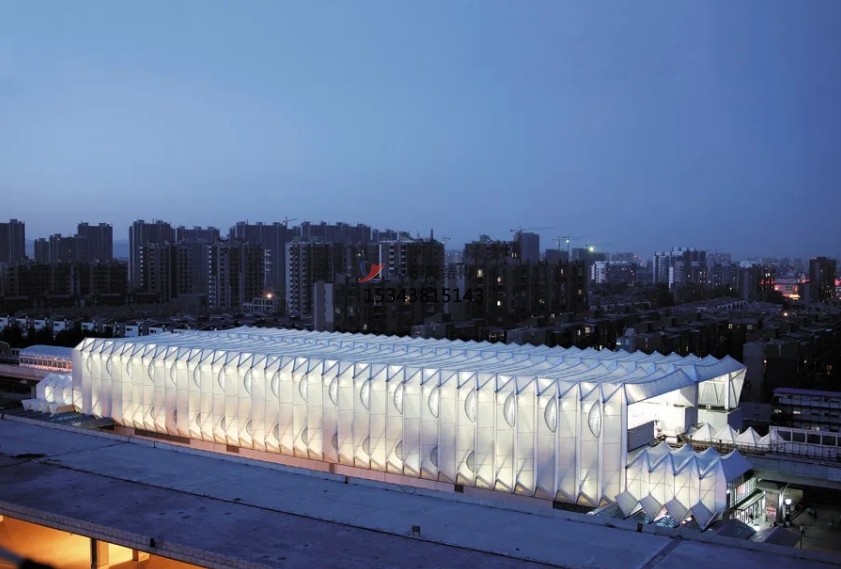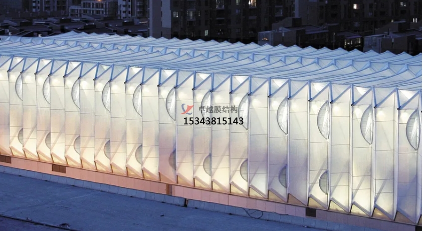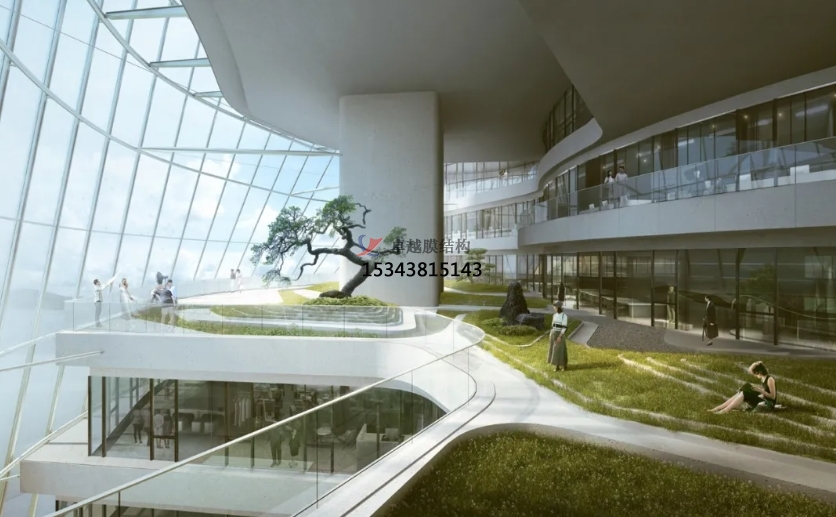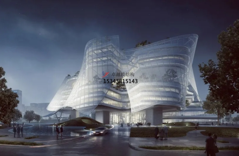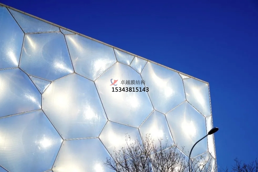 膜結(jié)構(gòu)使得建筑輕盈感十足,膜材料的良好透性使得建筑界面透光而不透視。由于該材料(ETFE)氣枕在陽光底下富有通透感光線可以通過漫射和折射進(jìn)入界面,讓膜結(jié)構(gòu)建筑呈現(xiàn)出朦朧夢幻之美。