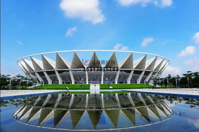 它的屋蓋為膜結(jié)構(gòu)屋蓋,屋蓋呈圓環(huán)型,外徑310米,內(nèi)徑125米。內(nèi)環(huán)由10根直徑8厘米的鋼索組成的受拉環(huán)。外環(huán)是受壓環(huán),分上下兩層,上層直徑310米,由直徑1米的鋼管混凝土組成;下層直徑275米,由直徑1.4米的鋼管混凝土組成,兩層鋼環(huán)間隔20m,中間由鋼管混凝土斜柱連接起來(lái),形成倒圓臺(tái)形。