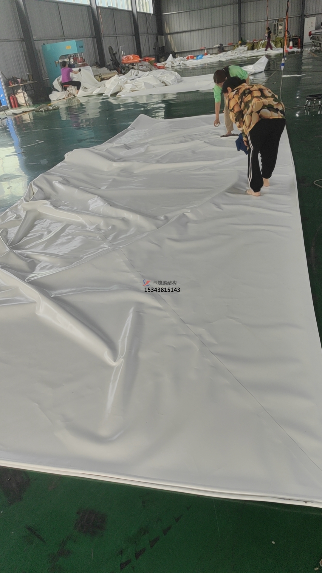通常,膜面的加工制作包含以下工序:(1)準備工作, 包括技術準備、場地及設備準備、膜材料進場檢測等;(2)放樣、排版與下料;(3)熱合試驗;(4)熱合加工;(5)邊角處理;(6)清洗、包裝。