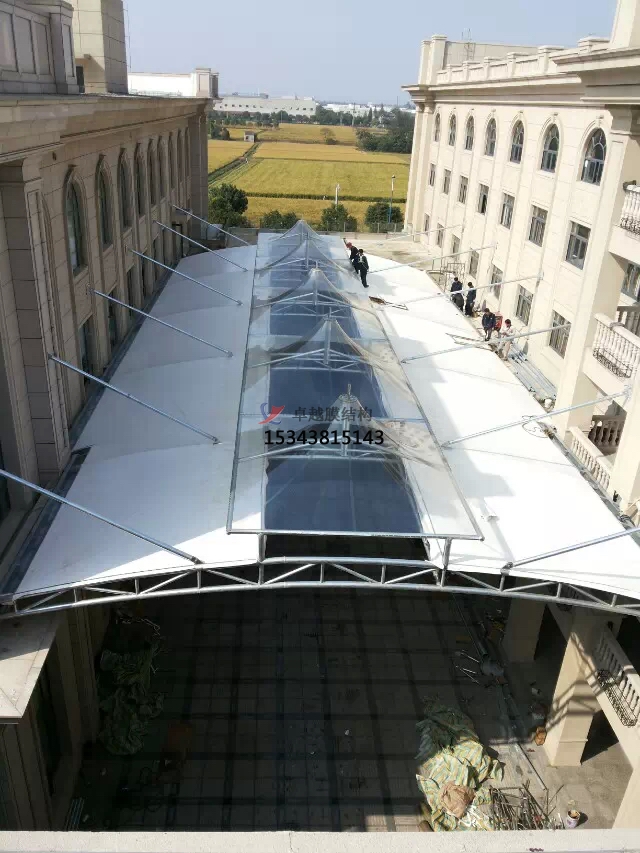 PTFE膜是在超細(xì)玻璃纖維織物上,涂以聚四氟乙烯樹脂而成的材料。PTFE膜更大的特點(diǎn)就是耐久性、防火性與防污性高。但PTFE膜與PVC膜比較,材料費(fèi)與加工費(fèi)高,且柔軟性低,在施工上為避免玻璃纖維被折斷,須有專用治工具與施工技術(shù)。