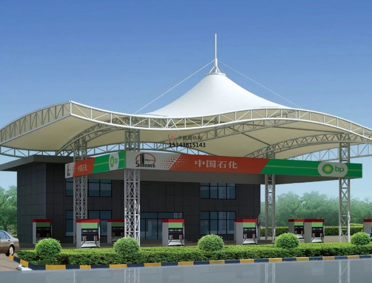 加油站的膜結(jié)構(gòu)適合采用的形式有:多點(diǎn)對(duì)稱拋物面、組合拋物面、馬鞍形拋物面錐形雙曲拋物面、拱支承型等等。膜結(jié)構(gòu)的鋼構(gòu)件、膜面及其它零配件都是工廠預(yù)制件,安裝方便,施工時(shí)間很短。非常適合工期緊,需要短時(shí)間投入運(yùn)營(yíng)的加油站工程。