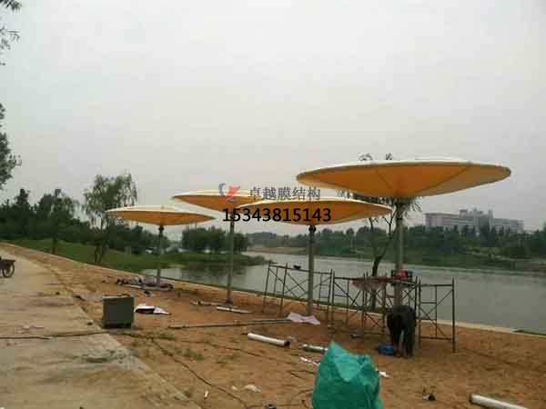 膜結(jié)構(gòu)景觀,是以建筑織物,即膜材料為張拉主體,與支撐構(gòu)件或拉索共同組成的結(jié)構(gòu)體系,它以其新穎獨(dú)特的建筑造型,良好的受力特點(diǎn)——成為大跨度空間結(jié)構(gòu)的主要形式之一。膜材料是指聚酯纖維基布或PVDF、PVF、PTFE等不同的表面涂層,配以?xún)?yōu)質(zhì)的PVC組成的具有穩(wěn)定的形態(tài),并可承受一定載荷的建筑紡織品。它的壽命因不同的表面涂層而異,一般可達(dá)成10-20年。