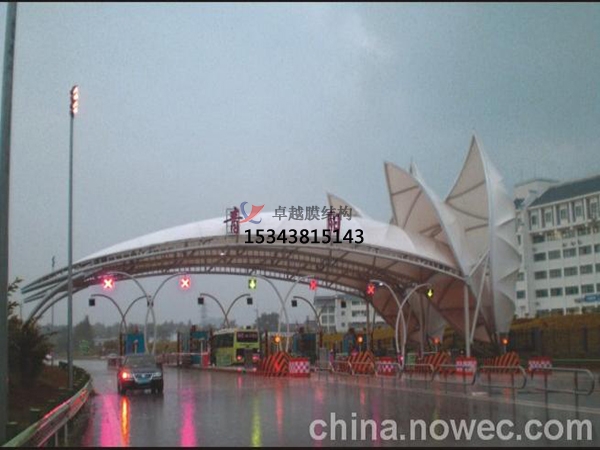 膜結(jié)構(gòu)收費(fèi)站是近年來(lái)在國(guó)內(nèi)開始流行的一種新式的收費(fèi)站結(jié)構(gòu)。它與以往的舊式收費(fèi)站相比,結(jié)構(gòu)更加輕盈,而且在使用中比較穩(wěn)固。它的材料使用了高分子膜結(jié)構(gòu)材料和支撐構(gòu)件共同組成,并且能根據(jù)支撐構(gòu)件的高低位置不同而呈現(xiàn)不同的形狀。因此在教育,商業(yè),體育館等公共場(chǎng)所都有很廣泛的應(yīng)用 收費(fèi)站在更初是作為一種能提供給車輛泊的地方,使車輛避免了直接面對(duì)風(fēng)吹雨打。用來(lái)保證自行車,汽車等在收費(fèi)站下不受損傷。