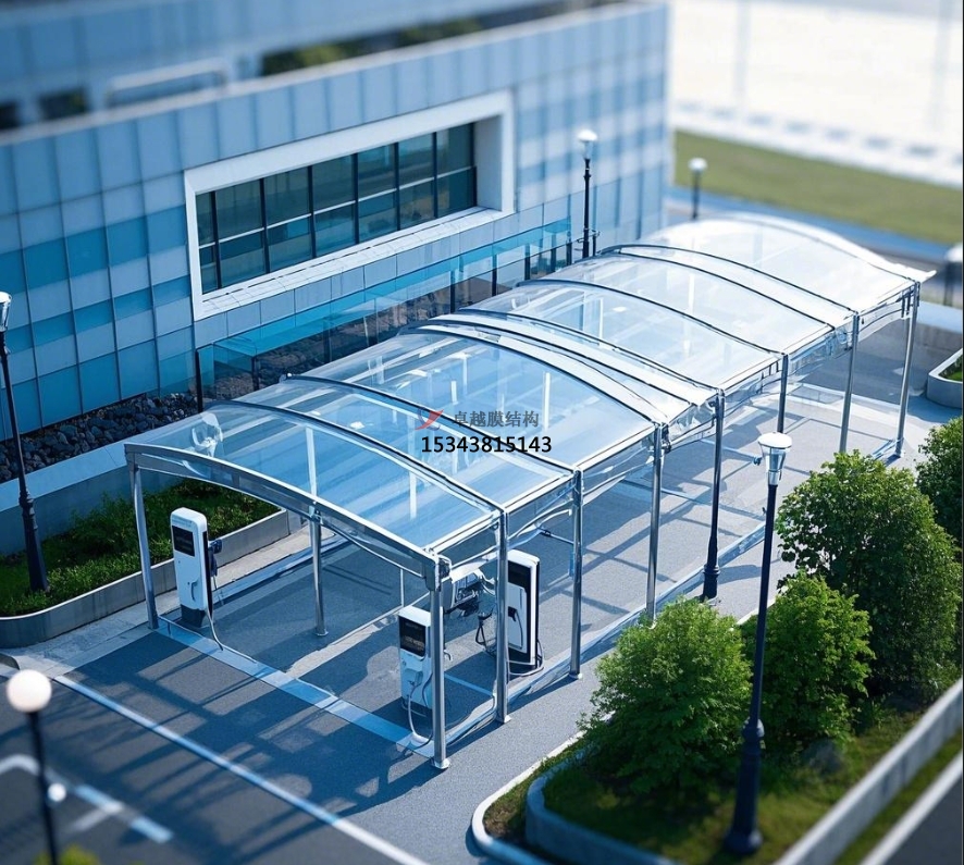 ??????? 膜結(jié)構(gòu)罩棚以其流暢的曲線、共同的造型,為充電站增添了異樣的美學(xué)魅力。它打破了傳統(tǒng)修建的刻板印象,展現(xiàn)出輕盈、靈動(dòng)的現(xiàn)代風(fēng)格。膜材的色彩豐富多樣,可根據(jù)充電站全體規(guī)劃風(fēng)格與周邊環(huán)境進(jìn)行挑選搭配,或是挑選新鮮明快的色彩,營(yíng)造舒適迷人的氣氛;或是與周邊修建色彩相呼應(yīng),融入城市景觀。比方,位于城市公園附近的充電站,選用綠色彩的膜結(jié)構(gòu)罩棚,與公園的天然環(huán)境相輔相成,成為城市中的一道亮麗風(fēng)景線,提升了城市形象。