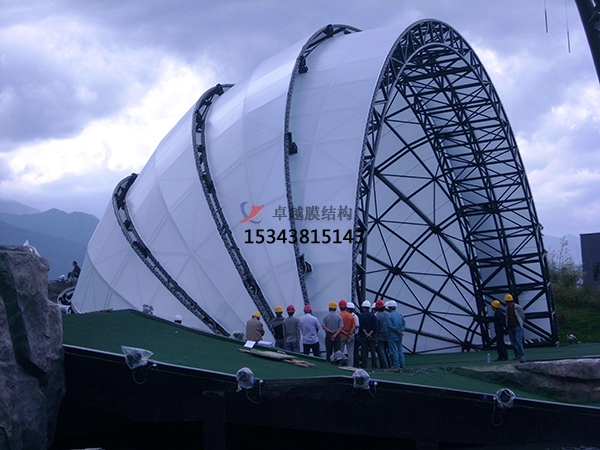 1、膜結(jié)構(gòu)建筑選用特殊的膜材作為建筑的"外殼",專利斜向鋼纜為傳力系統(tǒng),通過調(diào)整表里氣壓差構(gòu)成安全、安全的建筑系統(tǒng)。易操作和維護,并且費用相對比較低。