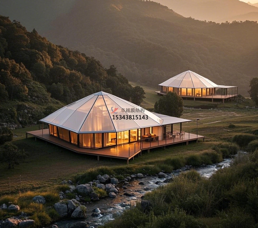 帳篷酒店膜結(jié)構(gòu)主要由膜材與支撐體系構(gòu)成。膜材作為核心部分,常用的如聚四氟乙烯(PTFE)膜材,具備超強(qiáng)耐候性,能在風(fēng)吹日曬、雨雪侵襲下長(zhǎng)期保持穩(wěn)定,不易老化損壞,且自潔性能出色,表面不易沾染污垢,始終維持潔凈外觀;乙烯 - 四氟乙烯共聚物(ETFE)膜材透光性極佳,可使充足自然光灑入室內(nèi),營(yíng)造明亮溫馨的居住氛圍,同時(shí)具備較高強(qiáng)度與柔韌性。支撐體系則包括鋼結(jié)構(gòu)、鋁合金結(jié)構(gòu)或索結(jié)構(gòu)等,為膜材提供穩(wěn)固支撐,確保整個(gè)帳篷結(jié)構(gòu)的安全性與穩(wěn)定性。
